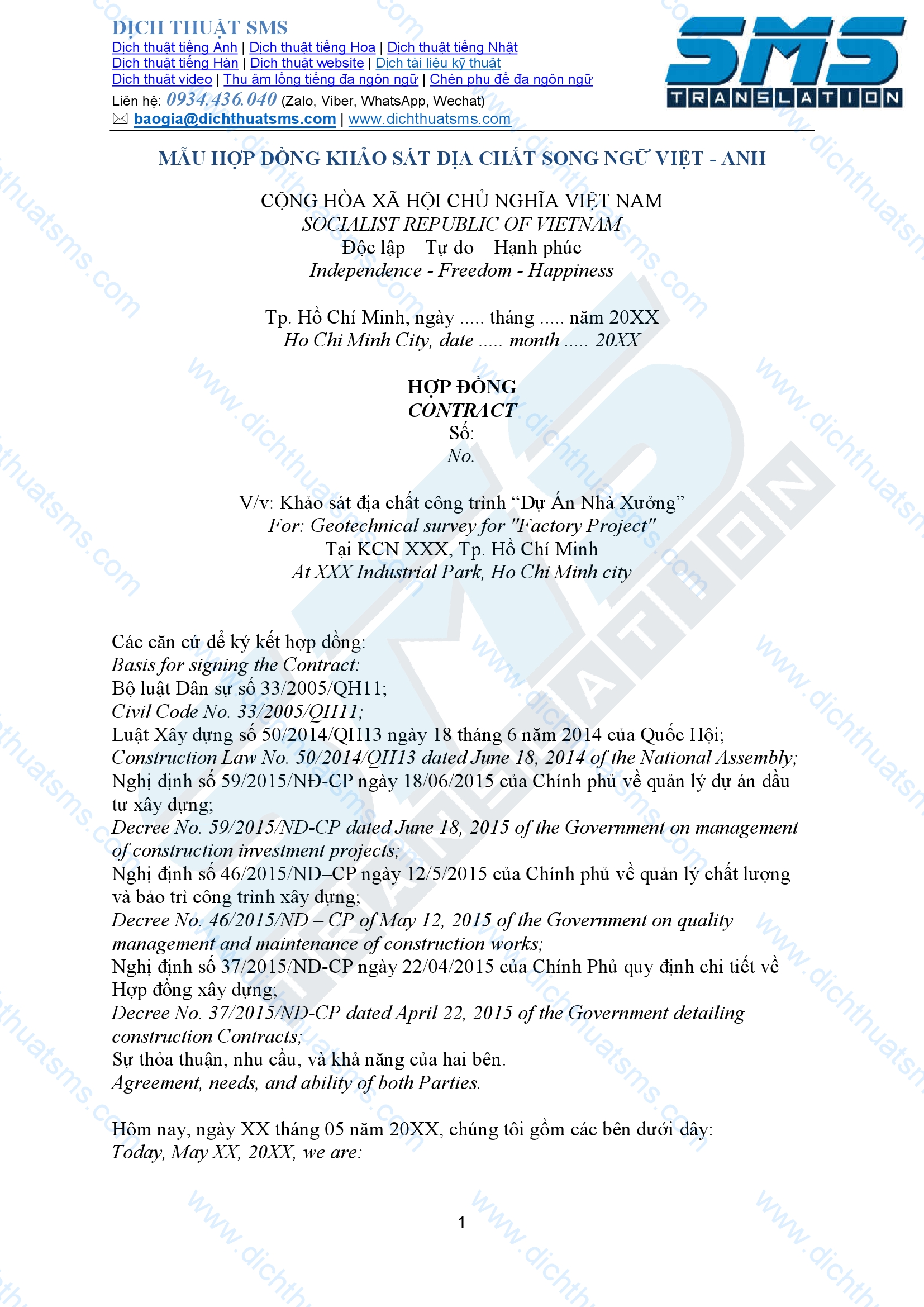 Dịch Thuật SMS xin giới thiệu mẫu bản dịch hợp đồng khảo sát địa chất tiếng Anh (Geotechnical survey contract), trình bày dạng song ngữ Việt – Anh để tham khảo dành cho các công ty xây dựng khi thực hiện công việc khảo sát địa chất trước khi thi công các công trình nhà xưởng, văn phòng.