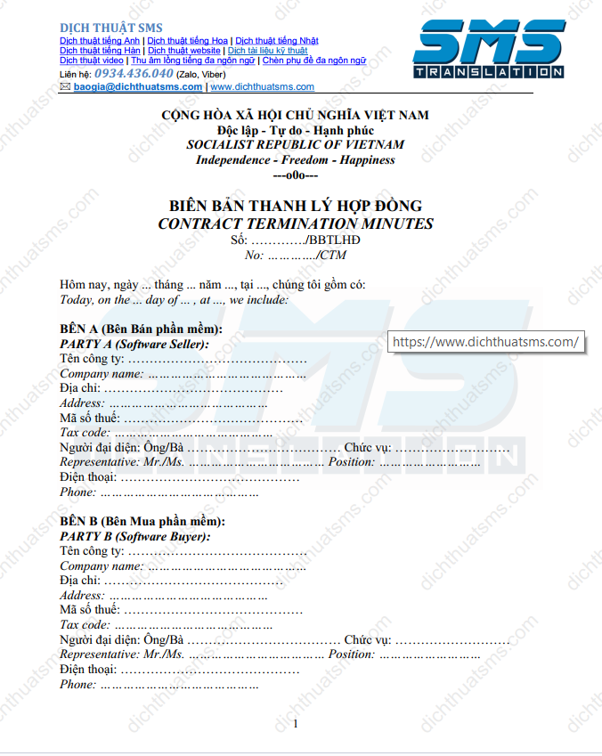 Kéo xuống để xem Mẫu biên bản thanh lý hợp đồng mua bán phần mềm song ngữ Anh Việt được dịch sang tiếng Anh bởi đội ngũ Dịch Thuật SMS.