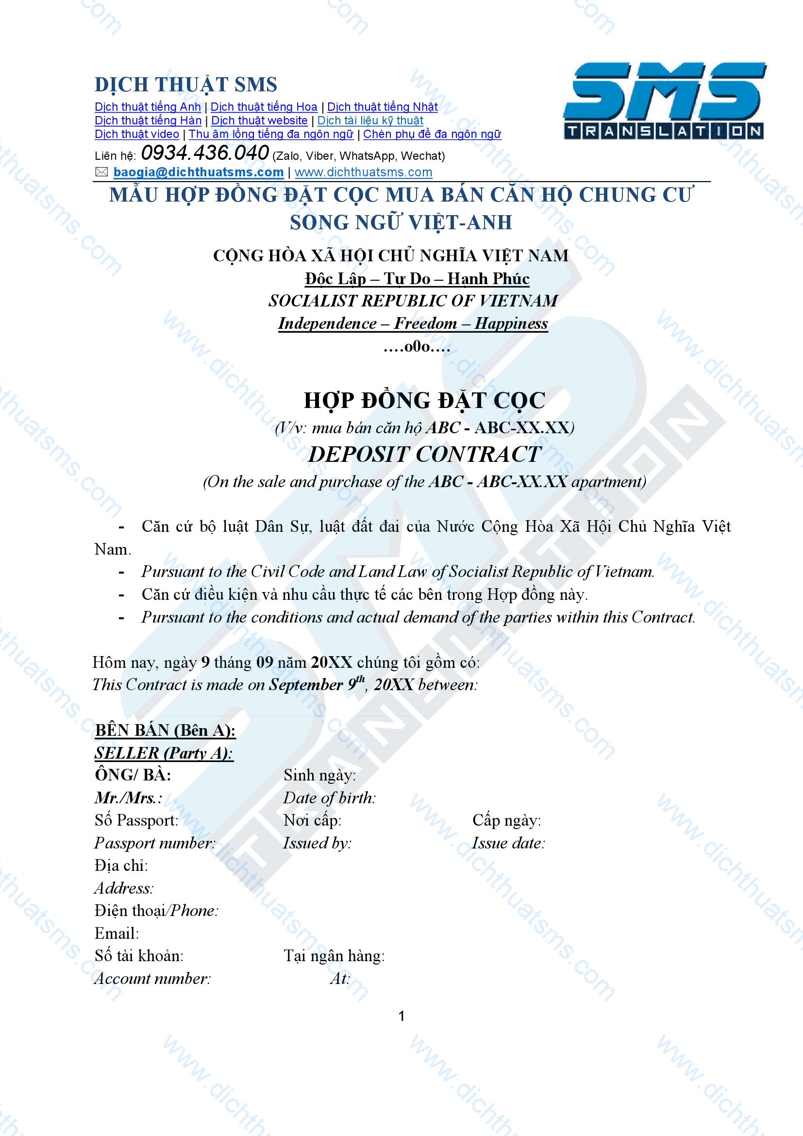 Dịch Thuật SMS xin giới thiệu mẫu bản dịch hợp đồng đặt cọc mua bán căn hộ tiếng Anh, trình bày dạng song ngữ Việt – Anh để tham khảo dành cho các giao dịch mua bán, chuyển nhượng căn hộ chung cư. Đây là sản phẩm từ dịch vụ dịch hợp đồng kinh tế tiếng Anh chuyên nghiệp của chúng tôi.